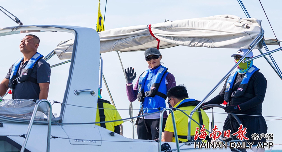 11月26日,在三亚-万宁往返拉力赛中,奥运冠军徐莉佳(左二)在天泽晨曦队的赛船上。徐莉佳作为海帆赛推广大使参加本届海帆赛。