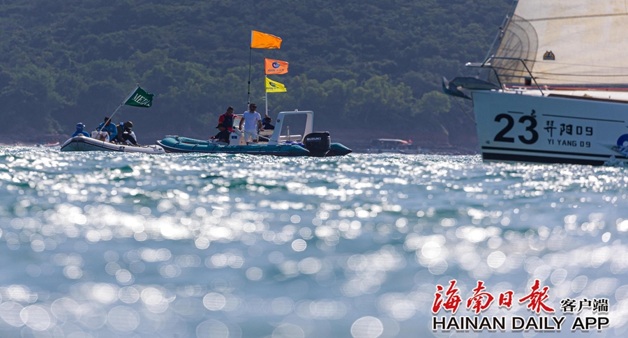 11月26日,在2023第十二届环海南岛国际大帆船赛三亚-万宁往返拉力赛起航点,参赛船舶等待裁判船发出起航信号。