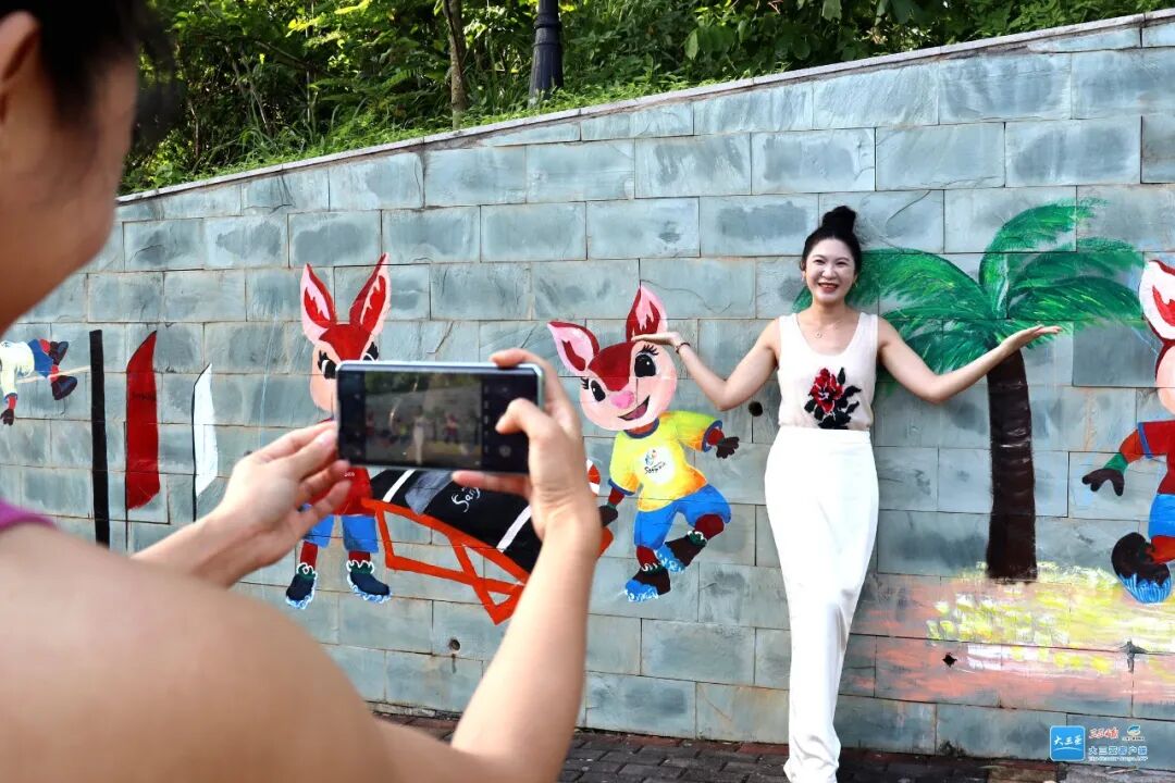 面对临春岭森林公园步道旁的亚沙会主题绘画墙,金鸡岭小学二年级学生贺小瑜主动参与创作,用童心彩笔勾勒出对盛会的期待;