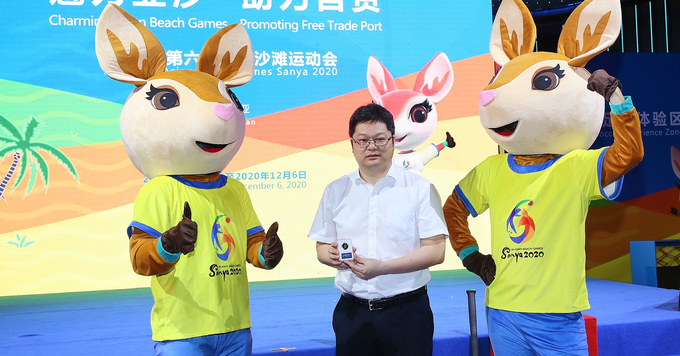 亚沙会组委会副秘书长、三亚市副市长周俊展示纪念章。