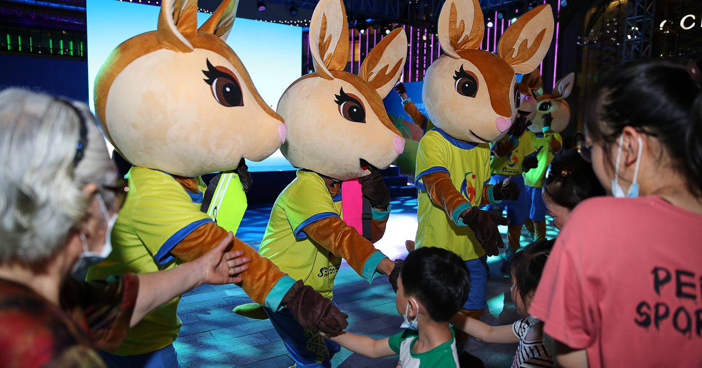 活动现场,8只亚沙会吉祥物“亚亚”人偶与游客亲密互动。
