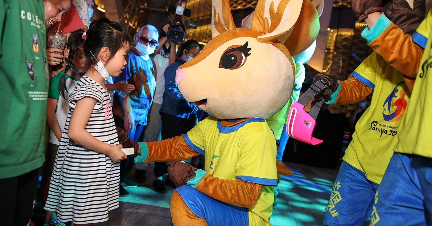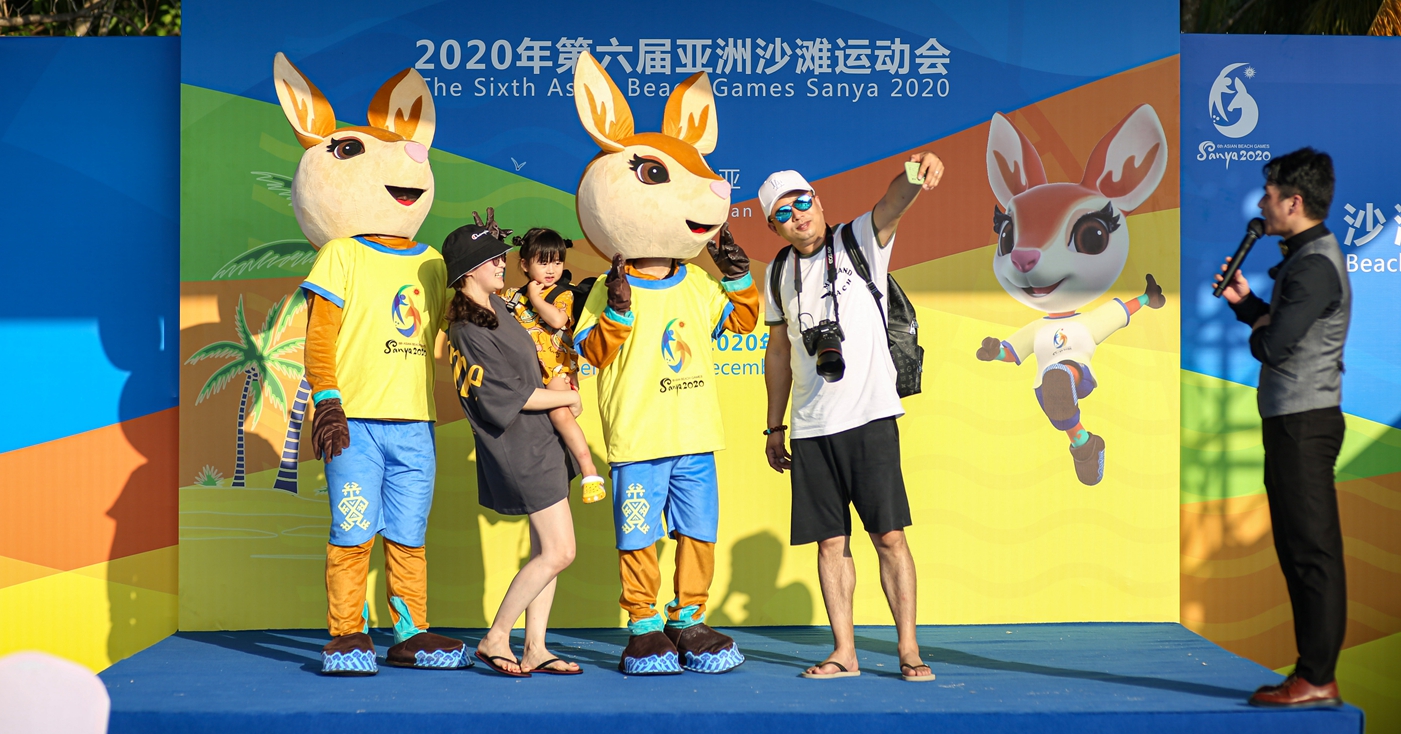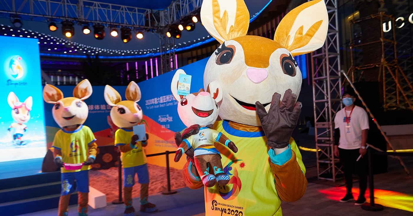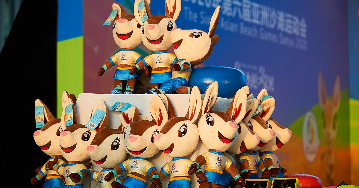 他们还轮番展示多款亚沙会特许商品,既有“亚亚”玩偶,也有运动腰包、镜子、冰箱贴、沙滩巾等特许商品。