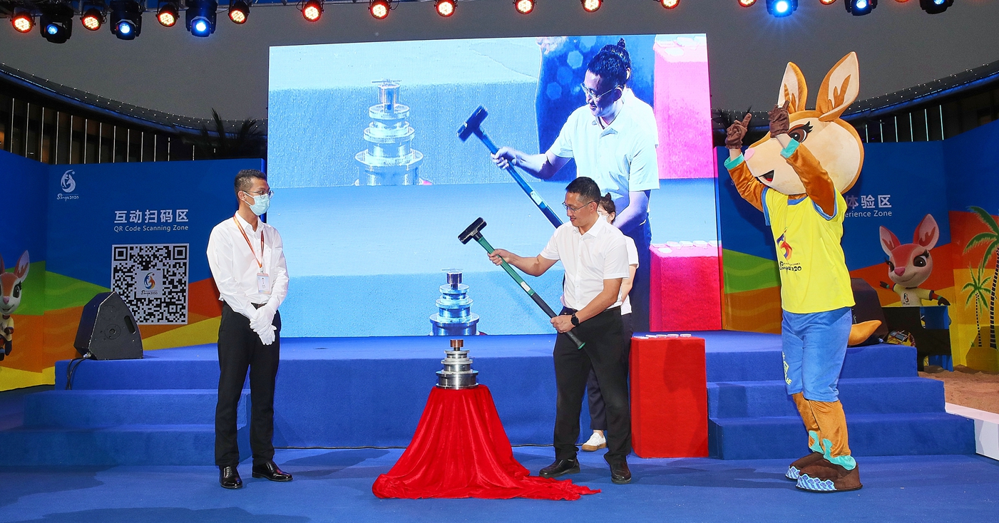 亚沙会组委会副秘书长、三亚市副市长周俊(中)体验打造亚沙会首枚纪念章。