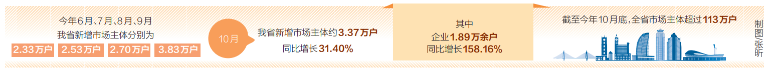 截至10月底,全省113万余户市场主体中,企业41.7万户,个体工商户71.49万户。