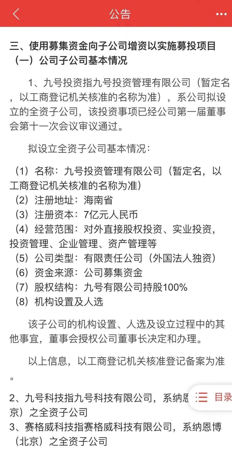 据公告内容,九号投资管理有限公司将落地海南洋浦,注册资本为7亿元,主要业务包括:对外直接股权投资、实业投资,投资管理等。九号投资管理有限公司成立后,将作为九号公司的国际区域总部,承接对外投资、国际贸易等重要职能。