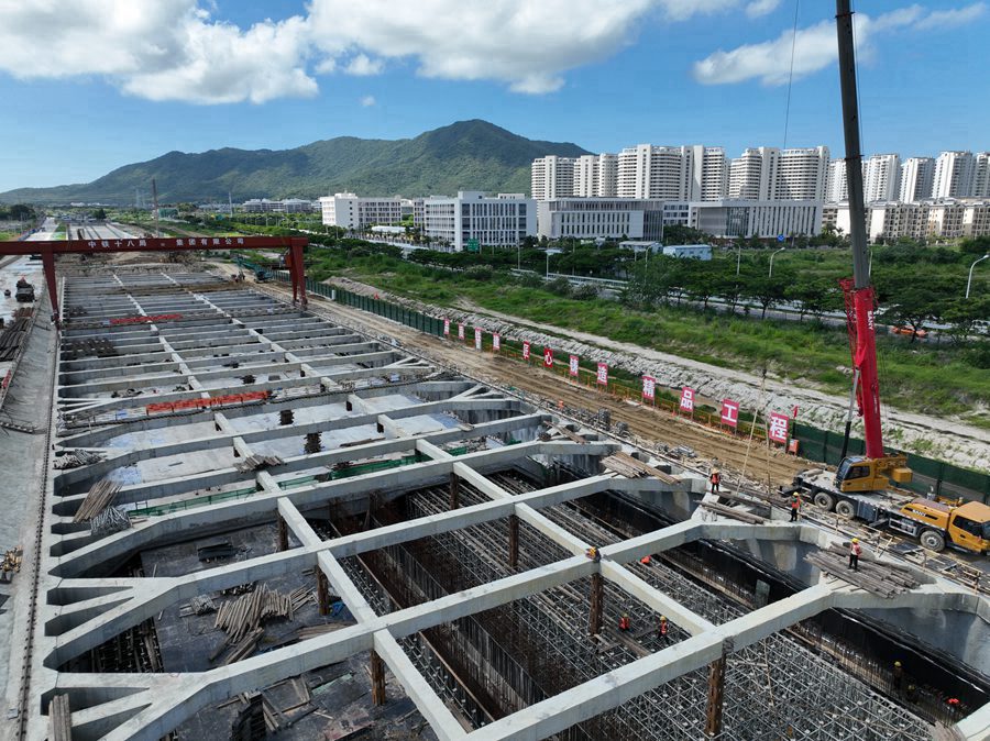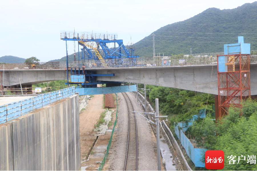 崖城互通匝道跨西环铁路施工。三亚崖州湾科技城开发建设有限公司供图