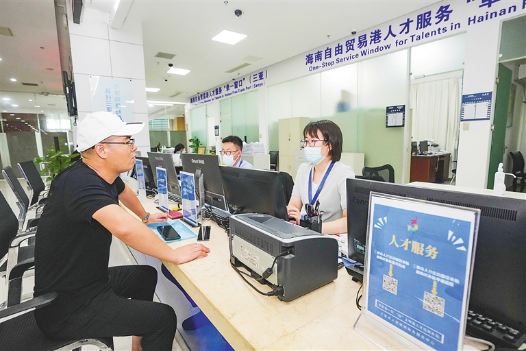 在三亚市政府政务服务中心办事大厅,工作人员为引进人才办理相关业务。(资料图)
