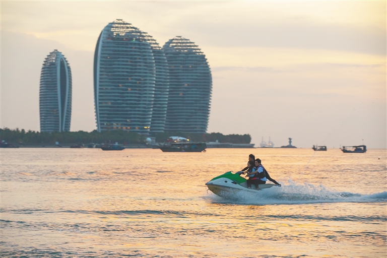 游客在三亚湾的日落中体验摩托艇。记者 谢式伟 摄