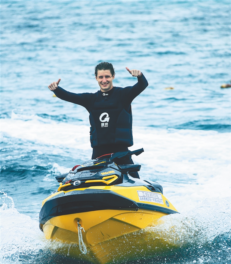 外籍游客正在滨海水运动乐园体验摩托艇。三亚湾滨海水运动乐园供图
