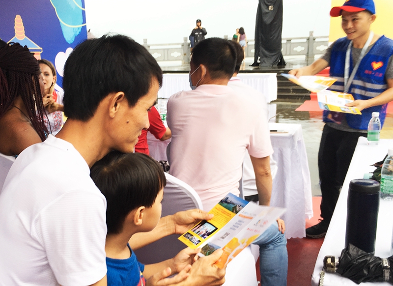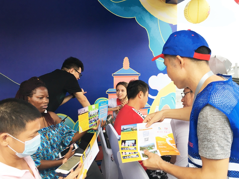 志愿者向留学生们发放亚沙会志愿者宣传手册。芮永辉 摄